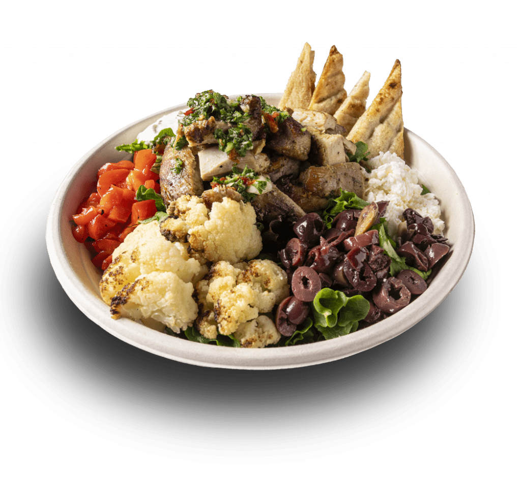 Spring Mix, Pita Chips, Tzatziki, Lemon Oregano Chicken, Charred Cauliflower, Roasted Red Peppers, Kalamata Olives, Feta, Sun Dried Tomato Chimmi, Side of Honey Balsamic Vinaigrette